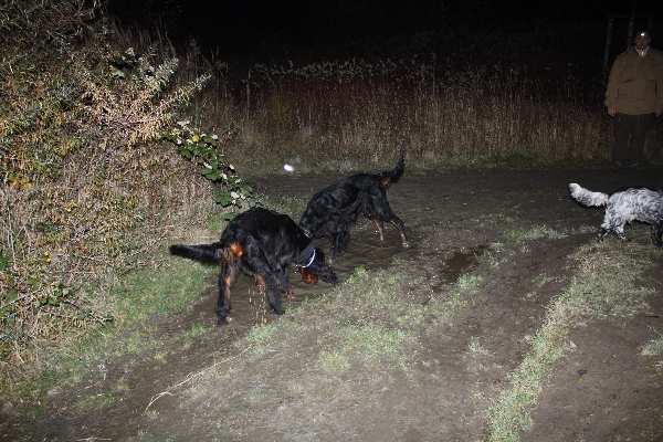 Die Dunkelheit fanden unsere Hunde natürlich super - dicke Setternasen funktionieren auch bei Dunkelheit sehr gut! Und so nutzen die Hunde die ein oder andere Gelegenheit, um kurz im Unterholz zu verschwinden. Nach einigen Sekunden waren sie meist direkt wieder da. Nur Theo gönnte sich einmal eine größere Runde, was zu einer Standpauke von Frauchen Martina führte.